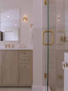 Soft light washes across warm white oak, catching the glow of gold fixtures and setting a calm, welcoming tone. The space feels composed rather than showy, a hallmark of MSI’s approach to residential remodeling. A white oak double vanity anchors the room with warmth and texture, while refined metallic finishes add subtle contrast.