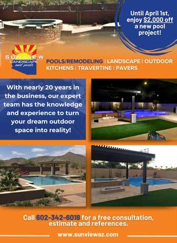 • Desert Art Pools LLC (DesertArtPools.com) is Peoriabased and can handle routine maintenance, tile cleaning and sealing, remodeling an existing pool, or building a new one. They also specialize in hardscapes, fire pits, gazebos, and outdoor kitchens. 602.619.0956