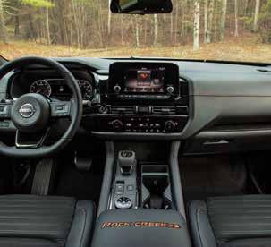 Under the Hood / The Pathfinder Rock Creek has enough get-up-and-go to let you drive with confidence. It has a 3.5L DOHC 24-valve 6-cylinder engine with 295hp. The 9-speed automatic transmission handles well, and you can easily switch between drive and terrain modes. The Rock Creek also has a tow hitch with a 6,000-lb capacity. Comfort and Technology/ I love a comfortable car and am also a tech geek. The Rock Creek satisfied both of those needs for me. The 10-way power driver seat has power lumbar support. The 12.3-inch digital dashboard, large head-up display, and Intelligent Around View Monitor made driving easy. Load the family into the three rows of seats, crank up the Bose audio system, open the panoramic moonroof, and sink into those leather seats for a great drive.