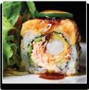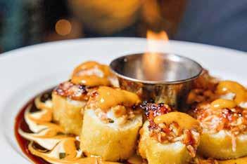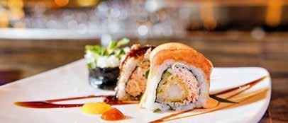 I enjoy the sushi menu, including the Cougar Roll with crab mix, seared yellowtail, garlic butter, sriracha, and eel sauce. My favorite is probably the Friends with Benefits Roll, featuring a spicy crab mix, tempura shrimp, cucumber, jalapeño, seared spicy salmon, eel sauce, spicy mayo, and garlic butter. For something different, you can opt for the Sugar Mamma Roll with salmon, tuna, crab mix, shrimp tempura, avocado, mango, soy paper, and a peach chili sauce that perfectly blends sweet and spicy. CONTINUED >