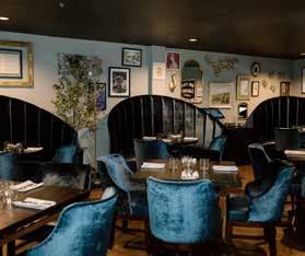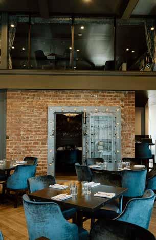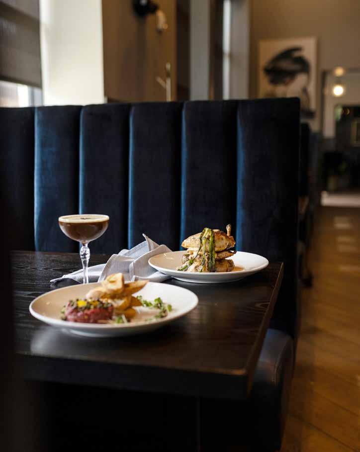 The bistro next door manages to be both approachable and upscale at the same time. The beautiful dining room features big, comfy booths, blue velvet upholstery, a long bar lined with mirrors, and even a dining table set inside an old bank vault with some of the original brick exposed. There’s not a television in sight, unless you count the old black and white movies that are projected soundlessly onto the wall.