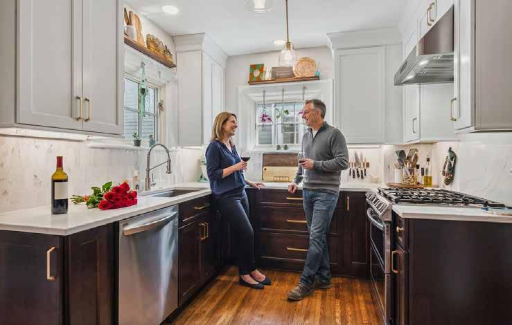 Crisp white wall cabinetry paired with rich espresso bases and warm brass accents create a kitchen that feels both bright and grounded then finished with clean quartz surfaces and just the right glow from glass pendants above. It’s the kind of space that makes everyday moments feel a little more special: coffee shared at the sink, dinner simmering on the range, a favorite song playing while everything has its place. With careful planning and precise execution, the process stays calm, and the result becomes the room you’ll always come back to.