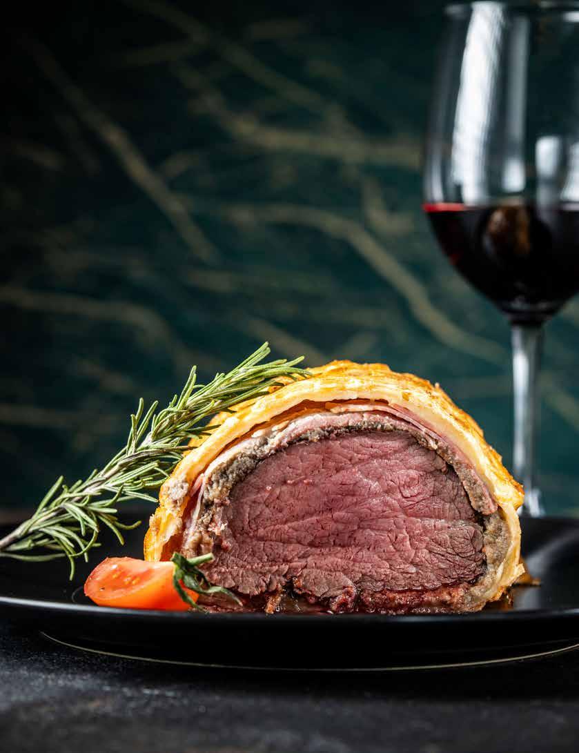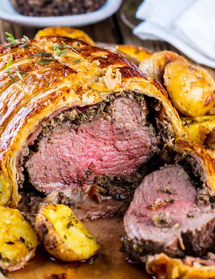 Culinary perfection. Indulge in the rich, flaky elegance of the classic Beef Wellington— a true holiday centerpiece.
