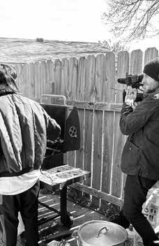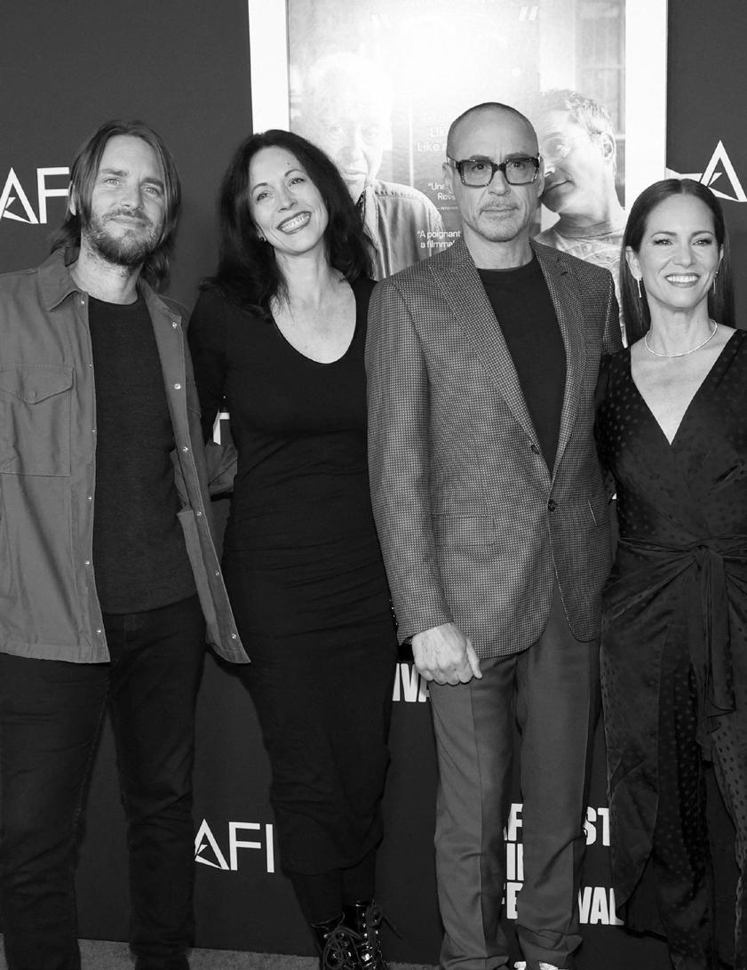 OPPOSITE PAGE: Kevin and Emily Barclay Ford with Robert and Susan Downey at the 2022 American Film Insitute Fest (Photo courtesy of Alamy) THIS PAGE, LEFT: Emily and Kevin Ford at the National Board of Review Gala (Photo courtesy of Alamy) | MIDDLE: Kevin Fort shoots a scene from a forthcoming documentary being filmed in Enid. | RIGHT: The couple at the American Film Institute Fest (Photo by Kevin Ford)