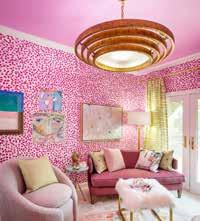 4. A wrought iron frame of concentric circles in a gold leaf finish adorns the ceiling of Henry Home Interiors’ Barbie sitting room in the 2022 Oklahoma Symphony Show House.
