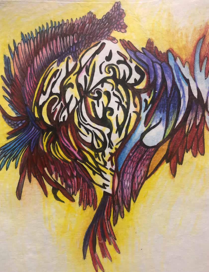 February’s duality resonates with my practice. I’m drawn to reflection at this time of year. My work explores transformation, often featuring symbols of growth and rebirth. Vibrant colors and dreamlike surrealist themes. I enjoy setting intentions for future shows, connecting with the community, and sparking conversations through my art.
