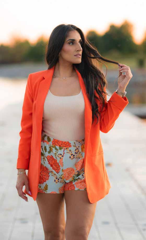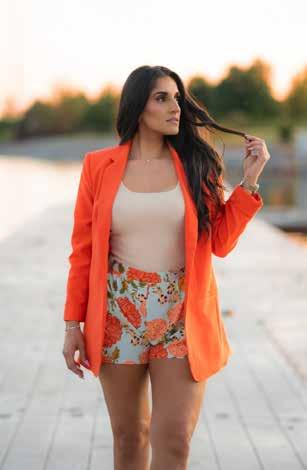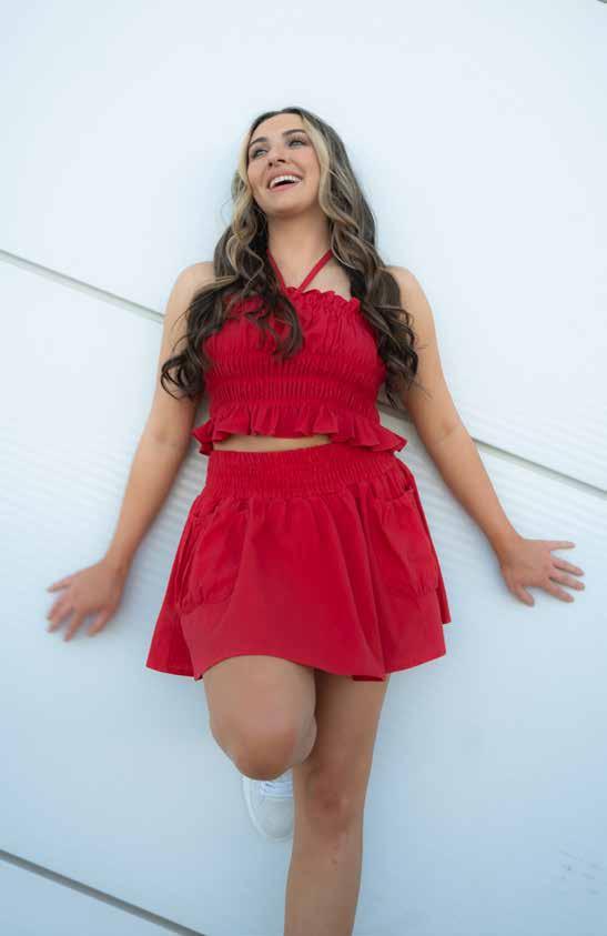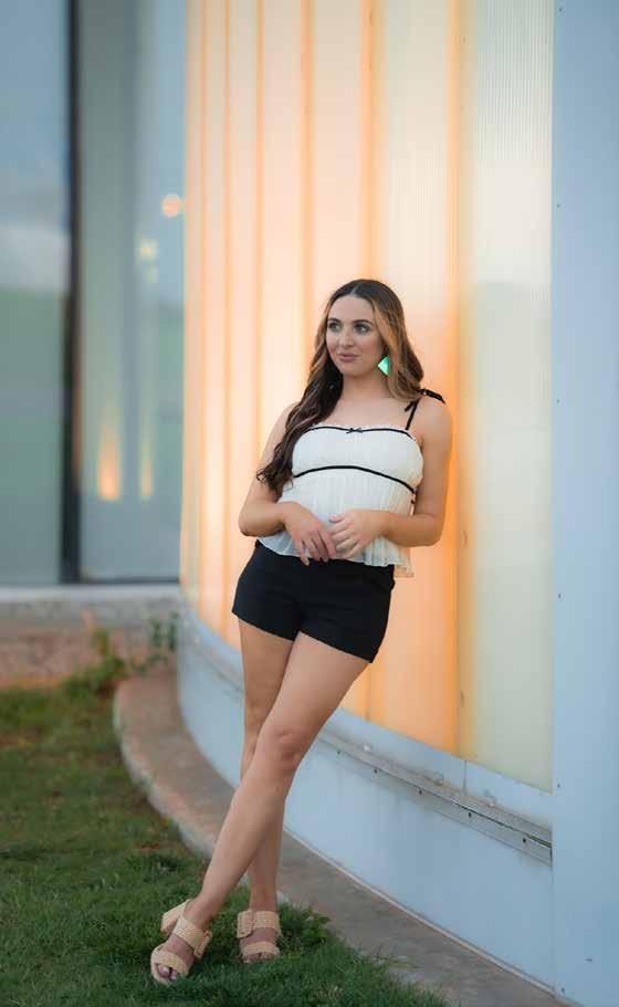 Clare Dooling gets ready for a day of carefree adventures in Pink Attitude Boutique’s “For the Fun of It Frill Cami Top ($39),” featuring contrast piping and a small, detailed bow in the front, adding a touch of playful charm; it’s paired with Perfect Escape’s high-waisted black shorts ($36).