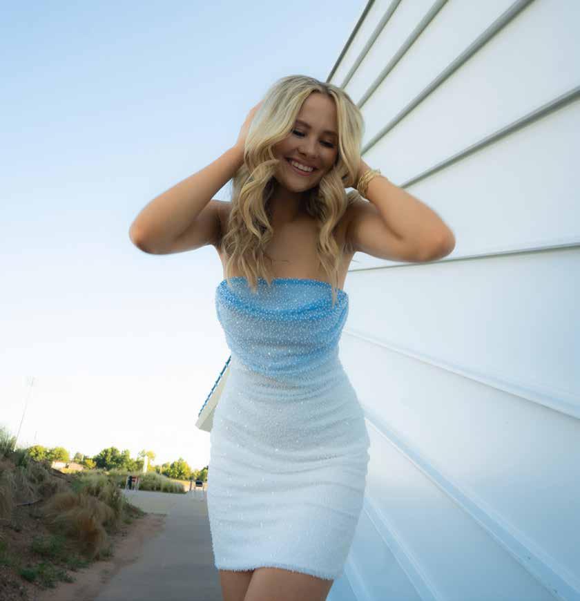 Megan is modeling a Summer Skies beaded strapless mini-dress ($82) that’s sure to dazzle at any event with its elastic top and sparkling sequins.