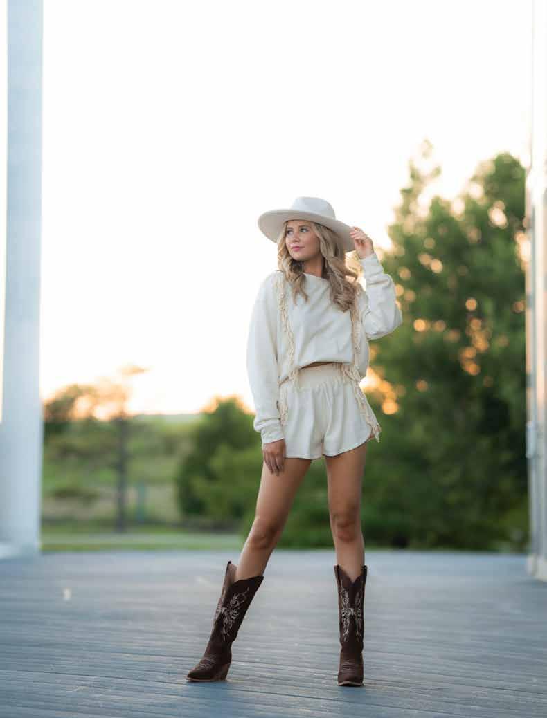 This lightweight sweatshirt and fringe shorts combo is perfect for those hot summer days, and the cream color makes it versatile for any occasion. Pair with Sammi Brown Flora cowgirl boots ($105) and Indy braided strap ivory flatbrim fedora hat ($42) Giddy up!