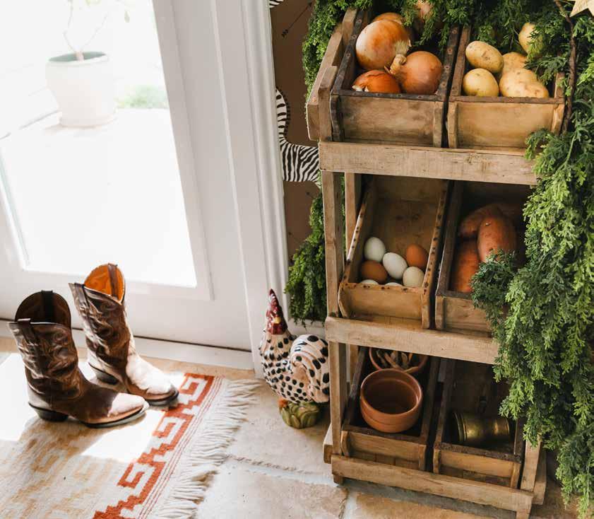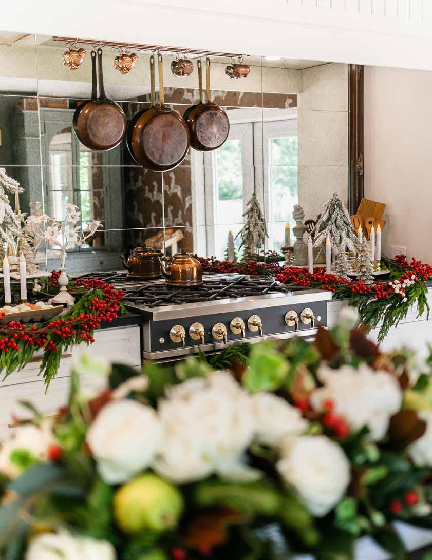 antique table as an island or an armoire as a coffee station. I relish those details—the conversation that’s created through history by putting old things with new things.” During the holidays, she leans into that philosophy, decorating with personal pieces that tell her family’s story: antique ornaments from her grandparents, a white ceramic Christmas tree her grandmother made by hand in a pottery class in 1984, and the sleigh bells from her grandfather’s farm that once jingled on his horses.