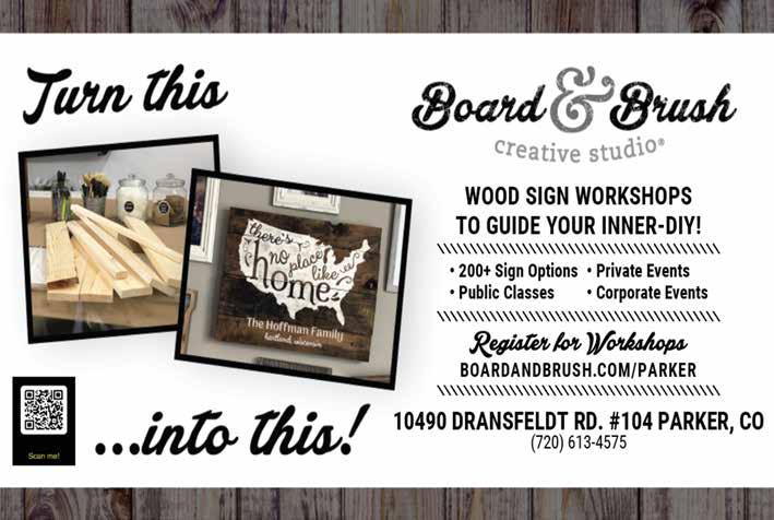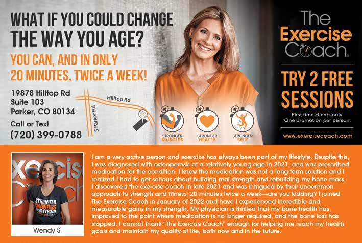 Self Confidence Comes from Self-Care Skin care treatments are not a quick fix, instead the goal is to promote long-term, sustainable skin health. GLO WELLNESS NOW OPEN IN PARKER 303-248-6690 @glowellnesscolorado jenn@glowellnessmedspa.com 11020 S. Pikes Peak Dr. S uite 240B • Parker, CO 80138 Jenn Henderson, AGACNP-BC Owner & Medical Direc tor All Ser vices provided by experienced Nurse Practitioner www.glowellnessmedspa.com WWW.SPASOFPARKER.COM 19555 E Parker Square Dr Locally Owned & Operated Located Behind Natural Grocers SPAS SPA & POOL CHEMICALS FILTERS TRAEGER PELLETS BBQ ACCESSORIES BILLIARDS BULL GRILLS ( 303 ) 841-7646 19 | CITYLIFESTYLE.COM/PARKER SEPTEMBER 2023