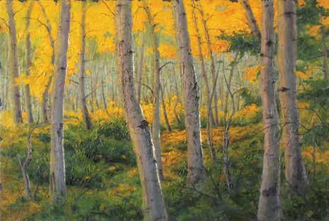 “There were so many aspens around me that they almost engulfed me. Yet, I never felt overwhelmed by those surroundings. The colors were so full and vibrant. I felt as if everything around me was hugging me in some way. As I painted this, I felt a great desire to portray the feeling of being surrounded and immersed in the fullness of beauty. I wanted the painting to feel tactile, with the visual perception of something very tangible in front of the viewer.”