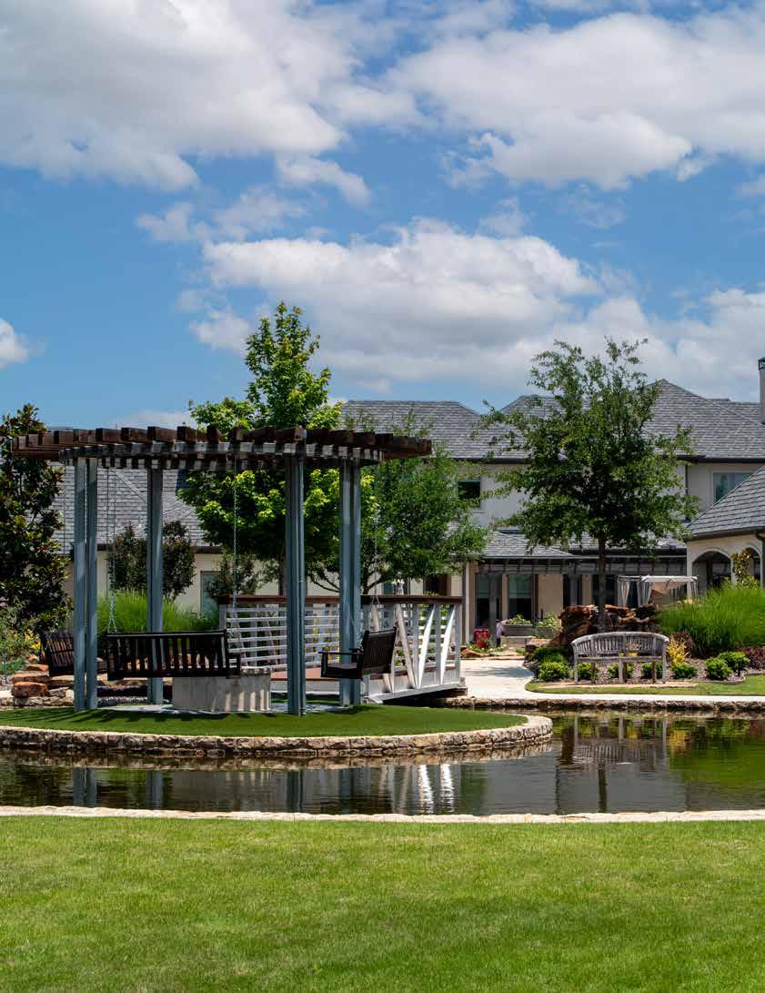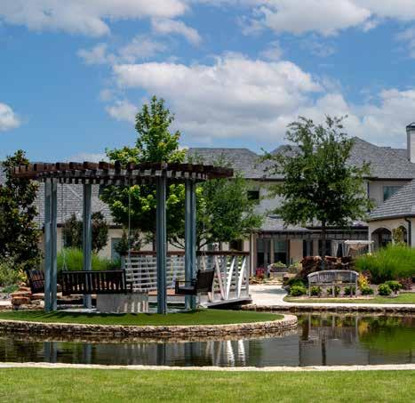 flickering flames, inviting you to gather around its warmth on cool evenings. The crackling fire dances in harmony with the dulcet sounds of nature, creating an intimate setting for storytelling and cherished conversations under the starlit sky. As you explore every nook and cranny of this backyard sanctuary, you stumble upon a charming pergola perfectly placed along a quaint path to the middle of the pond. A second fire-pit surrounded by luxurious swinging benches allows you to take in a 360 degree view of the backyard paradise. In this backyard oasis, nature's wonders blend harmoniously with human