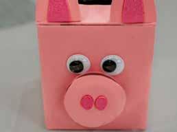 3 . Cover the recycled cap or lid with pink paper and glue it below the eyes. Cut and add two oval shapes for the nostrils. Lastly, poke a small hole in the back of the box for the tail, and feed the twirled pipe cleaner through the hole. Now you’re all set to bring home the bacon!