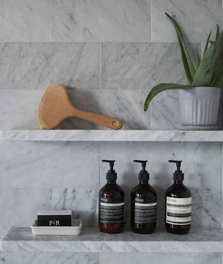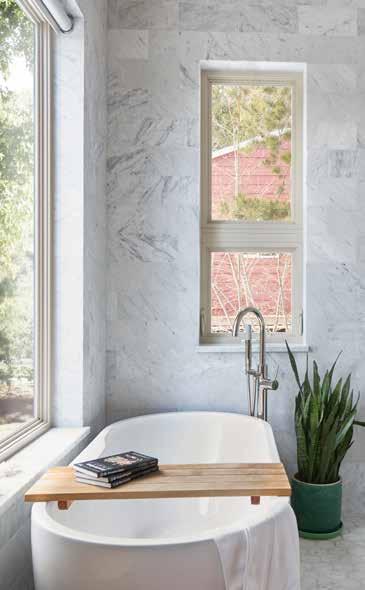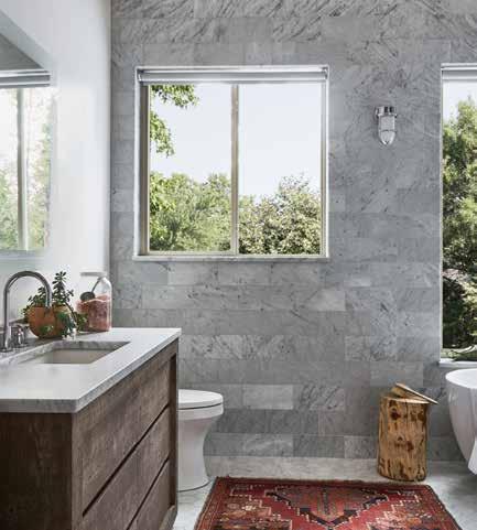 Now to the bathroom. Not only is there a beautiful open view of the trees with solitary peace, but the room is also decked head-to-toe with grayscale marble. If you are afraid to get your feet wet with an all-marble bathroom, maybe cold feet is a concern? Don’t worry—a vintage rug does the trick. Overall, this beautiful space is a real-life Pinterest board that has us inspired to renovate and refine.