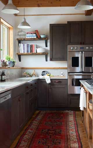 The homeowners were able to combine textile inspiration from all over the world to create this cozy and eclectic space. Warm red kilim and Persian rugs ground the space and add warmth and texture while the traditional patterns impart a sense of familiarity and timelessness. Indigo-dyed throw pillows add a bohemian flair inspired by African mud clothes and indigo dying techniques of Japan. Indigo has been everywhere lately—maybe because the textiles remind us all of our favorite pair of selvedge denim and a soft white T-shirt. The leather knobs on the kitchen cabinets latch perfectly onto the wooden kitchen shelves to complete the natural look of this home.