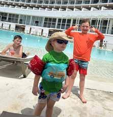 1: Girl Dad, Kirk Webster, Owner of Hardy Webster Dental, embraces dance life with his daughters. 2: These fur babies enjoyed their front-row seat at the Flooded With Love event. 3: Friends, Olivie and Camryn, are enjoying all of the summer camps around town. 4: Angel Mills, the dog, poses with her human, Logan, capturing a moment of pure happiness. 5: Miss Abigail is ready to catch some waves with her fluffy sidekick. 6: Three brothers living their best lives while on vacation, making unforgettable family moments together! 7: Celebrating 20 years of exceptional care and dedication at Her Healthcare Partners in Women’s Health.
