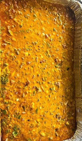 Step 2. Cube the block of Velveeta cheese, deseed and dice your jalapenos, mince 2-3 cloves of garlic, and rough chop 1/2-1 cup of cilantro after removing the stems. Add ingredients to the aluminum pan in sections and toss in the can of Rotel.