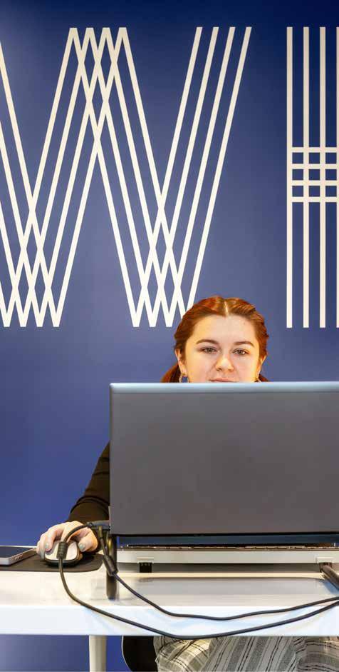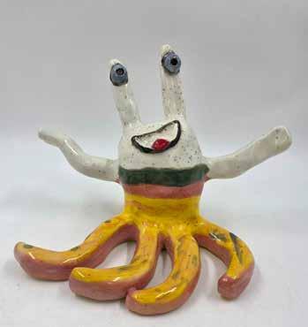 students’ artwork. “Sometimes I have a video that will blow up,” she says. In 2024, after she posted about the monster project, it went viral. “I was sitting in my studio over April break, and I got a phone call from the Kelly Clarkson Show. First, I hung up. They called back and invited us to New York City. Three or four days later, we were on an airplane.” The show, which aired in May of 2024 as part of Teacher Appreciation Week, featured Mundy, Bastille, and two of their student artists.