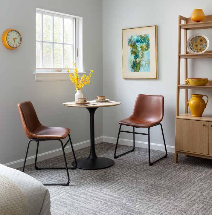 The 28-inch round dinette table is paired with lightweight chairs that residents can move with ease. Since there’s no space for a desk, the dining table and small tulip table double as space for computer use, paperwork, hobbies, or crafting.