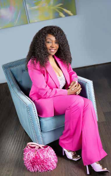 Top: Crafted with intention this oneof-a-kind pink leather bag, Raphia, compliments the bold suit perfectly. Amplifying the modern Sheroe who embodies confidence and purpose.