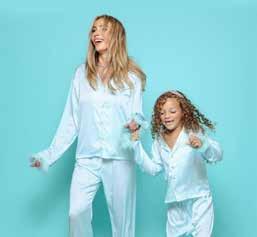Featuring a soft silky baby blue top and pants with feather trim and jeweled buttons, this set is the coolest ensemble for a night out or staying in. The best part? You can match Mom! Available in sizes 12 Months - Adult L.