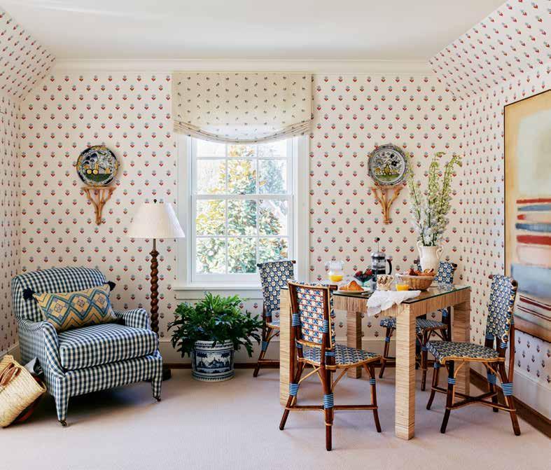 “Indian Tulips” wallpaper by Ottoline swathes the walls in the breakfast nook. Antique polychrome Delft plates from Kim Faison Antiques rest atop brackets found at Hamilton Stuart in Charlotte.