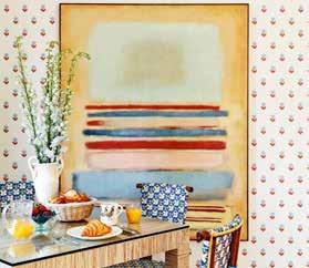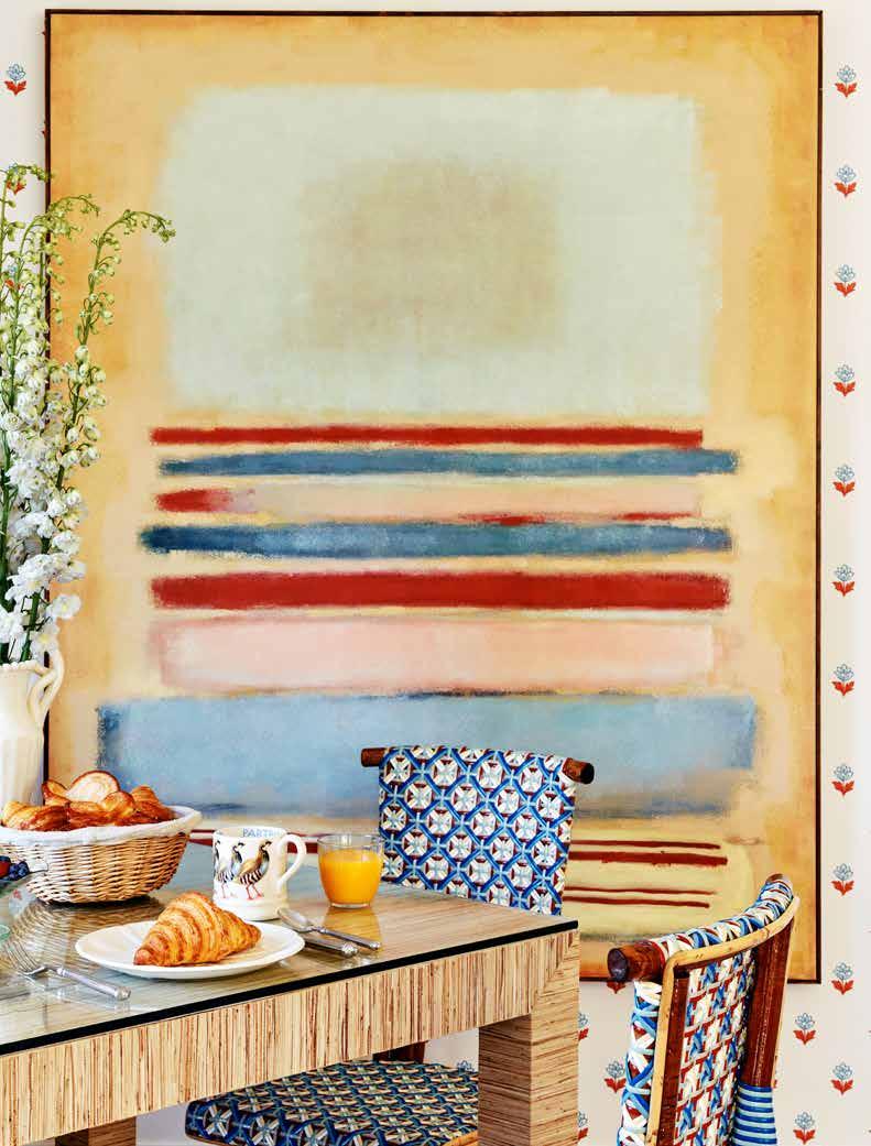 An abstract painting by Diane Lightsey imbues color and style in the breakfast nook, where a flower-filled Frances Palmer vase accents a Villa & House table.