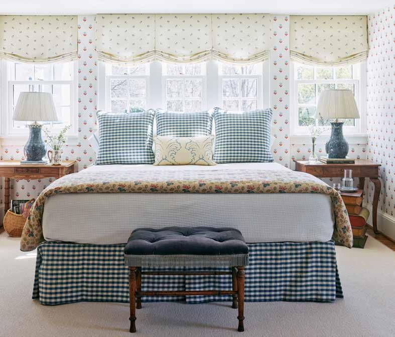 Décors Barbares’ floral print linen voile, “Polonaise”, drapes the windows in the bedroom, where the bed is flanked by tables from Heritage in Charlotte. Handmade ceramic lamps from Reed Smythe in Nashville illuminate the area. The gingham fabric on pillows and bedskirt is by Colefax and Fowler.