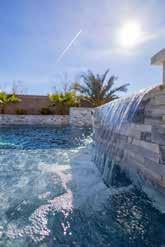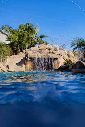 Owners Chuck and Teri Hewitt have used many fun elements in the design of their own pool. The free form shape gives the impression of a tropical space, bordered by palms and a fun waterfall feature that hides a grotto for swimmers to shelter in. Deck jets create a fountain effect and a comfortable baja bench for kids or those who simply want to dip their feet, gives everyone something to enjoy.