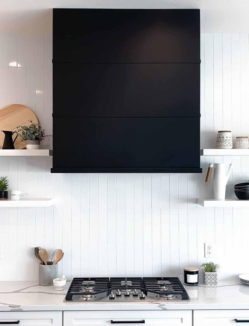 A sleek kitchen that is both modern and inviting.Contrasting Wood