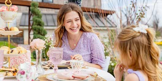 We asked Rebekah to design the perfect Mother's Day tea party for moms Emily and Shelly alongside their daughters Remington and Zealand. The lace tablecloth in blush is an elegant backdrop to this layered and intricate tablescape with golds, pinks, and florals. Even in the approach to the table