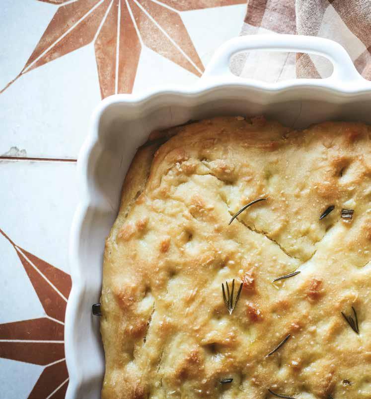 Preheat the oven to 425°F. Drizzle the remaining 2 tablespoons of olive oil over the dough. Rub your hands with olive oil and use your fingers to make indentions on the surface of the dough. Sprinkle it with salt and rosemary and any desired toppings. Bake for 20-30 minutes or until golden brown.