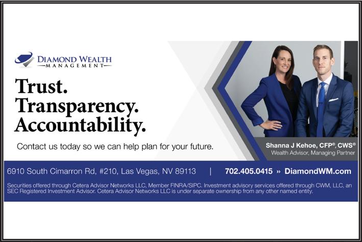 Las Vegas Native Shanna Kehoe, CFP®, CWS®, is managing partner and wealth advisor with Diamond Wealth Management. As a wife and mother of twins, she understands how a busy lifestyle can prove challenging with each new stage of life, which fuels her passion for planning and walking the journey with her clients.