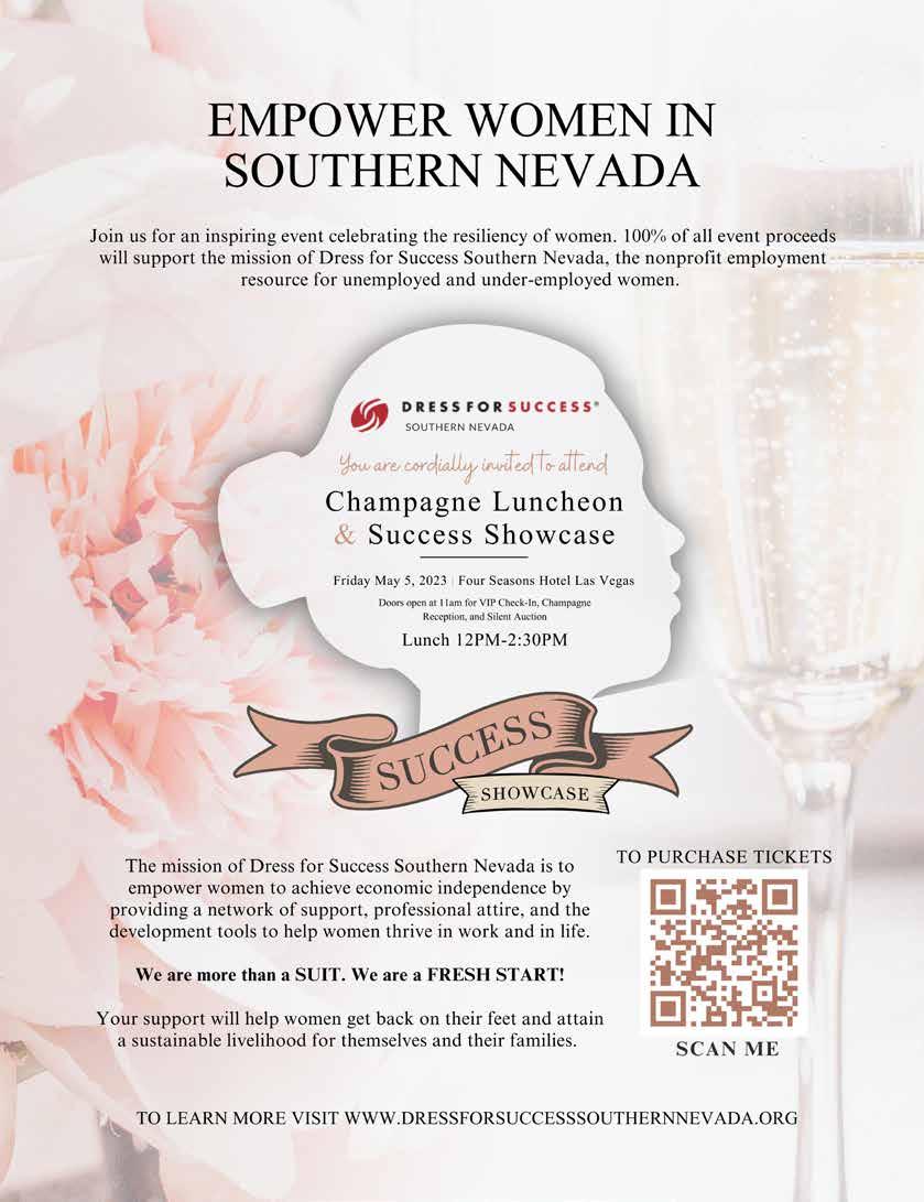 Join Dress for Success Southern Nevada for its 2023 Success Showcase & Champagne Lunch at the Four Seasons Las Vegas for an awe-inspiring event that will celebrate the resiliency of clients, volunteers, and community partners. Doors open at 11:00 a.m. for VIP check-in, a champagne reception, and silent auction. Visit www.dressforsuccesssouthernnevada.org for tickets or more information.