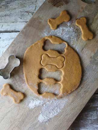 Preheat oven to 350 degrees and line baking sheet with parchment paper. In a bowl, mix all ingredients except flour and blend well. Gradually add the flour until the dough isn’t sticky. Roll dough into a ball. Lightly flour your surface and lightly kneed. Use a rolling pin to roll dough to ¼-inch thickness. Use cookie cutters and place dough on baking sheet. Bake for 20-25 minutes. Drizzle with peanut butter (optional).