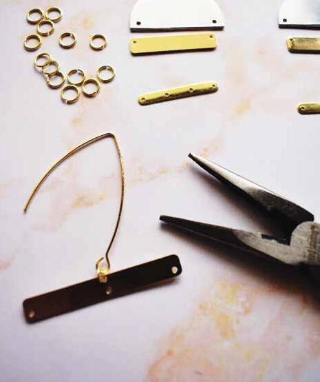 Take your half-circle stamping blanks, large gold bars and medium gold bars and arrange them in the order you want your earrings to flow. You can see how we arranged ours, but consider switching up the placement of each item for varying earring styles.