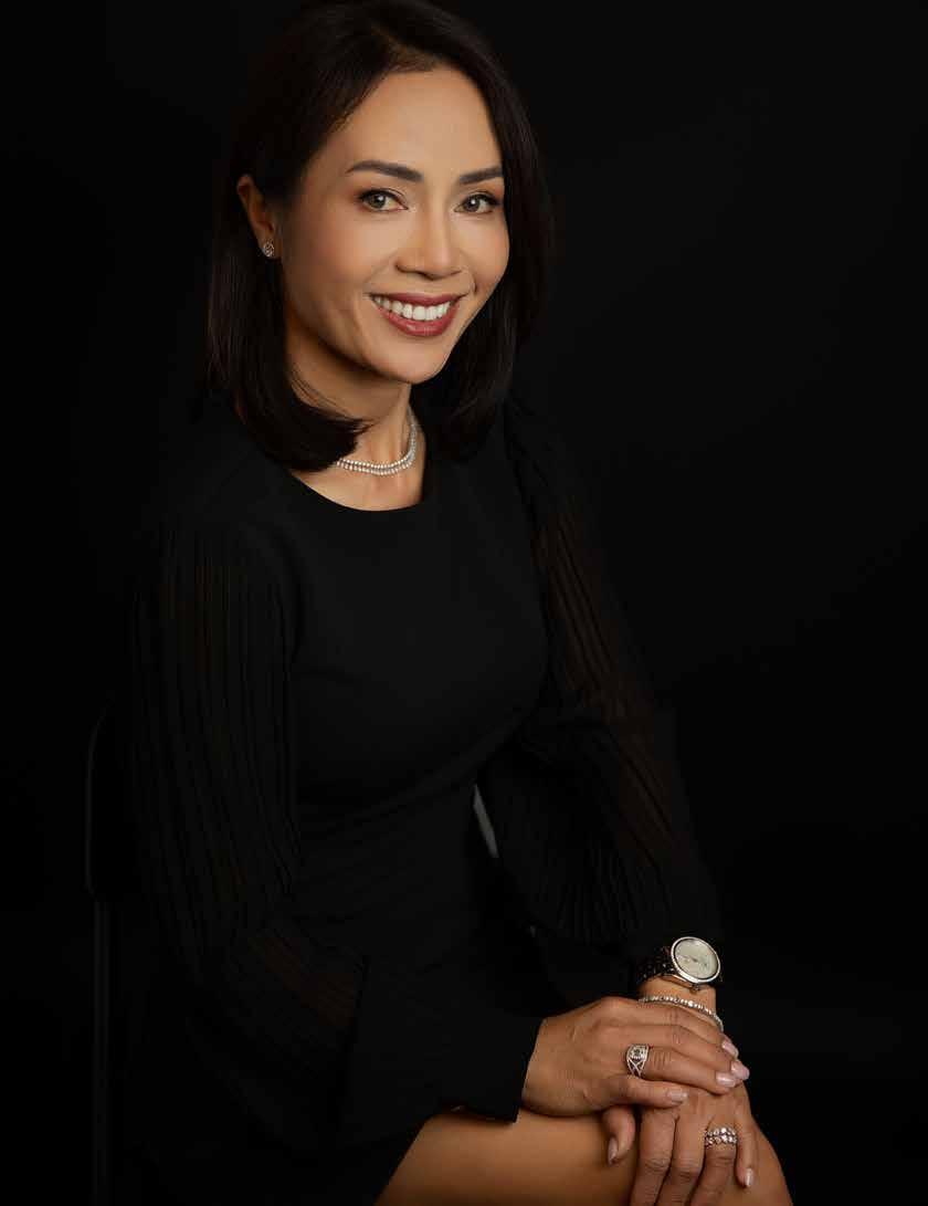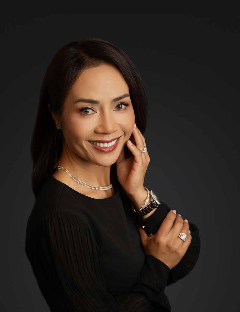 Summerlin Resident Nittaya Parawong wearing jewelry from T-Bird Jewels: Arzano 18k white gold and diamond choker, Christopher Designs 18k white gold and Crisscut® diamond bracelet and rings, Norquain 37mm Swiss watch with Mother of Pearl Dial and diamonds. inside the