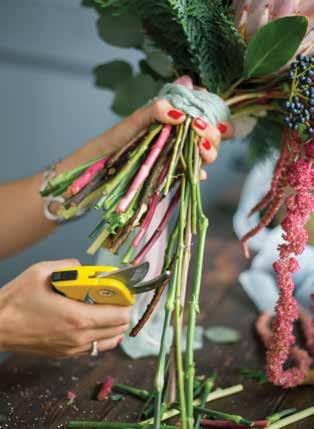 Step 2: Now it’s arranging time — think focal and filler. The best way to start the arranging process is by choosing your most interesting or favorite flowers — this will be your focal point. Hold the focal flower(s) upright and add your supporting blooms around it. Make sure to turn the bouquet as you build so that the design is as desired. Once this is complete, add your filler flowers to finalize the look. Filler options include baby’s breath, ivy, fern, eucalyptus and more.