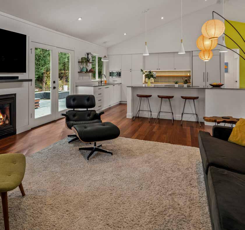 The home was partially remodeled in the 2000s to open up the living space and remove some unnecessary walls. “Despite its age, the architecture of the house had a very contemporary feel, with clerestory windows flooding the living room with light, and beautiful Brazilian cherry wood floors throughout,” says Carol Duffy, owner of AC Cabinets.