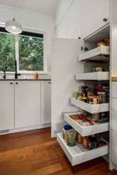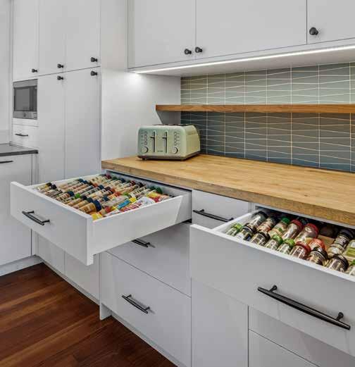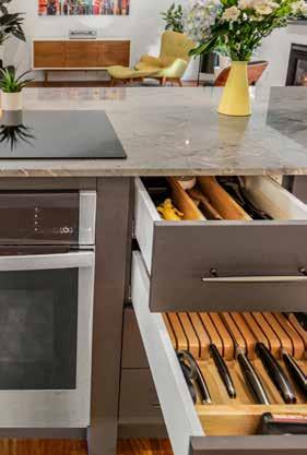 For the kitchen, the original five cabinets and awkward pantry weren’t supplying enough storage. With the help of a contractor, hired to oversee the construction, AC Cabinets optimized space by opening up the pantry wall, reconfiguring the kitchen island, and creating more storage space. “The clients now had 50% more counter space as well as seventeen cabinets, including two fullheight pantry cabinets, in place of the five small cabinets they had previously, all in the same space,” Duffy explains.