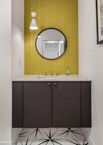 “We used a floating vanity. These always make the room feel a little larger because you see more floor. We kept the color scheme simple - white and charcoal gray, with a pop of fun color from a full-height, acid-yellow glass tile backsplash.”