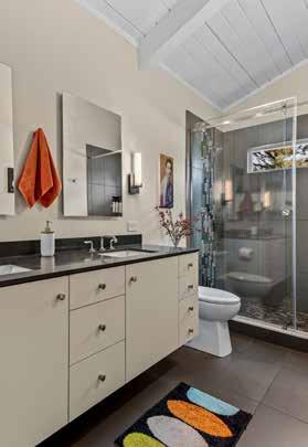 The bathrooms received similar treatment. Twelve inches was borrowed from the master bedroom to transform three smaller spaces into one flowing area. New, floating cabinets were installed not only to update the overall visual impact, but also to create the illusion of more square footage. “With the help of the contractor, we opened up the master bathroom, adding a window and a huge shower in place of a small tub and shower unit, and replacing an awkward corner cupboard with a tall linen closet and floating vanity,” Duffy says. A tub was also added to the second bathroom.
