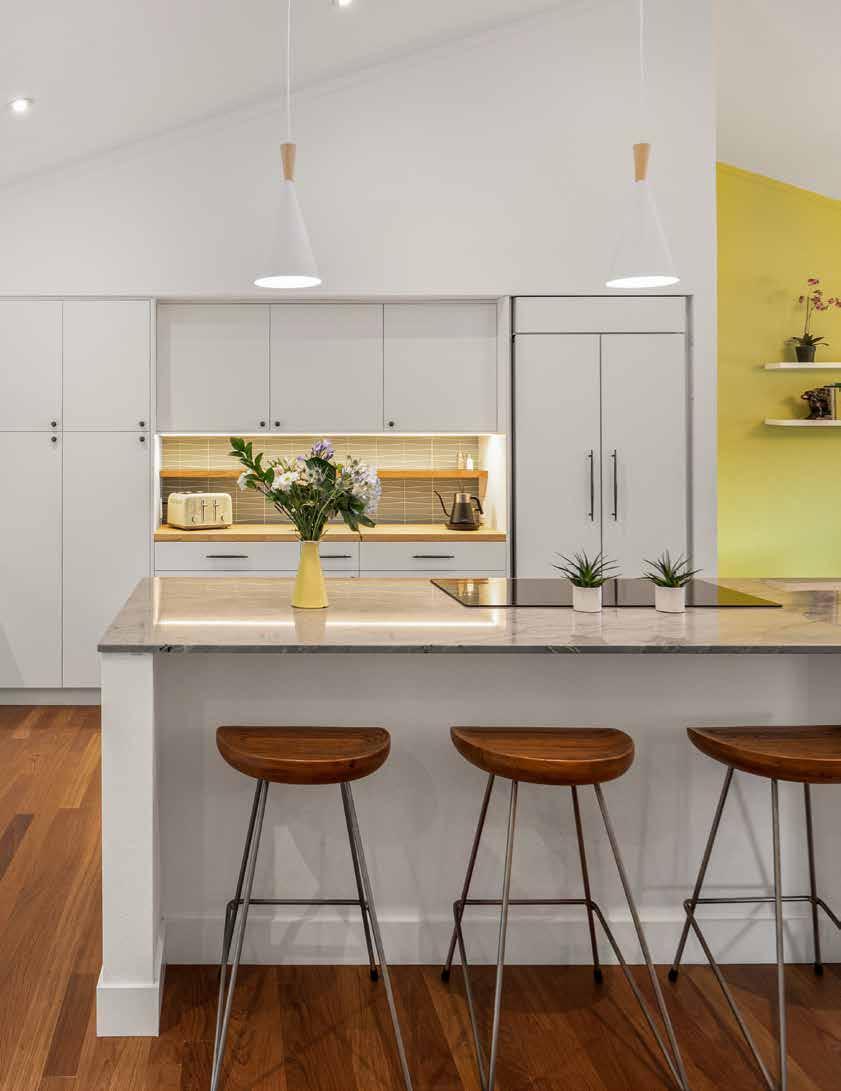 AC Cabinets kept the main materials simple, opting for mostly neutral tones. However, touches of color were added with fun bathroom tiles and a soft sea-green mid-century style glass backsplash tile in the kitchen to contrast with the matte white scratch-resistant laminate cabinetry, used throughout. “For the countertops, we chose a softly veined quartzite, with butcherblock as a contrast for the breakfast bar nook,” Duffy says. The overall effect was just what the client asked for—a more intentional space with a minimalist feel.