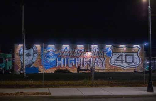 Street, created by artist Naem. Another gem is the (pictured) Lincoln piece, which spans across a large wall along 4th Street (Old Hwy 40), not far from State Historical Marker 220 (which commemorates the ‘Fight of the Century’ between Jack Johnson and Jim Jeffries in 1920).
