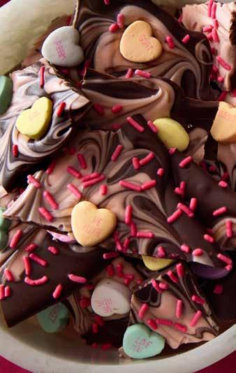 3. Melt semisweet chocolate the same way you melted white chocolate. Pour onto the prepared baking sheet and spread out into a large rectangle using a spoon or rubber spatula. Drizzle white chocolate mixture on top, then use a knife or toothpick to swirl the layers together. Sprinkle top of bark with conversation hearts and sprinkles.