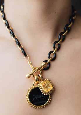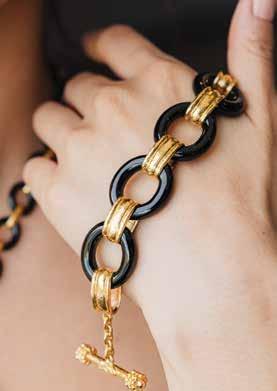 Necklace with links of black jade and 19 karat gold, and black onyx pendant by Elizabeth Locke Jewels, available exclusively at Mednikow Jewelers, 474 Perkins Extended.
