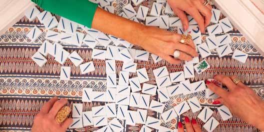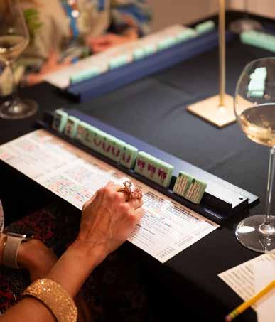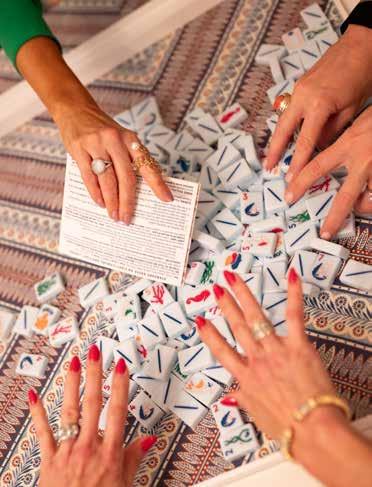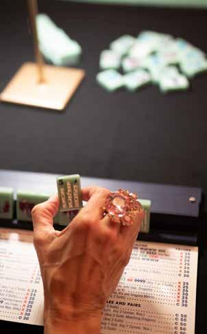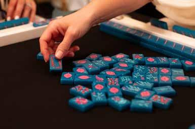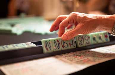 tiles make during a shuffle. The rhythms of the game are particularly suited to conversation and comraderie, similar to Bridge. The shuffle and deal are the hardest part of the game, involving multiple steps and moves like building walls, “curtsies,” a Charleston and “cupcakes.”