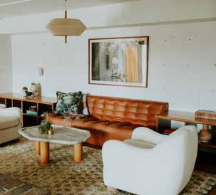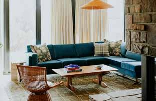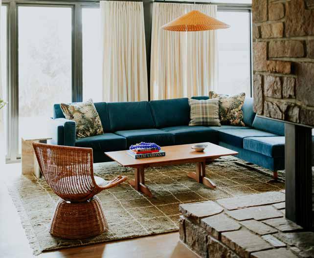 The den and living room spaces are divided by an original stone fireplace. Hayley mixes rattan and soft upholstery with mid-century vintage pieces.