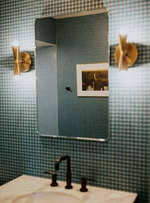 To stay nostalgic, Hayley used midcentury selections for the vanity and lighting. The bright blue square in the wallpaper is reflected in the tile.